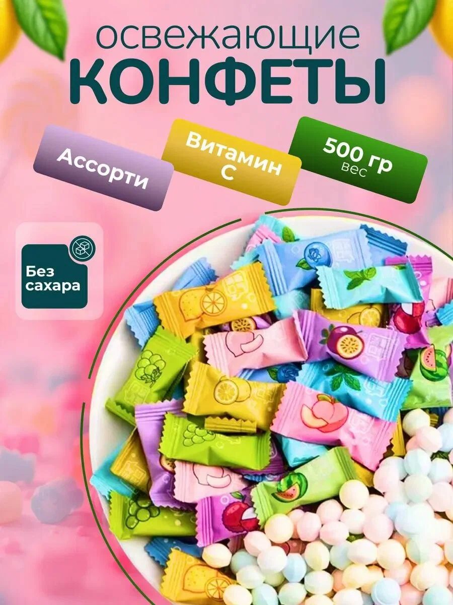 Освежающие леденцы с витамином С, без сахара, 9 ярких вкусов, 500гр. Выгодная цена 430 рублей