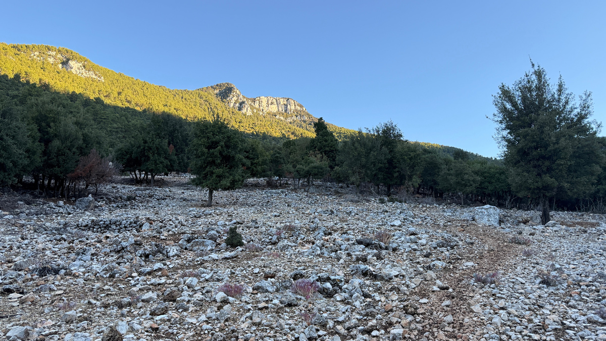 Чем выше мы поднимались, тем отчётливее становились видны теплиц Демре. Казалось, мы никогда не уйдем от них. Но зато какой тут запах хвои — прямо как у пицундской сосны, когда она на солнце нагревается. А когда поднимаешь взгляд вверх, то видишь, как в воздухе невесомо парит желтая пыльца.