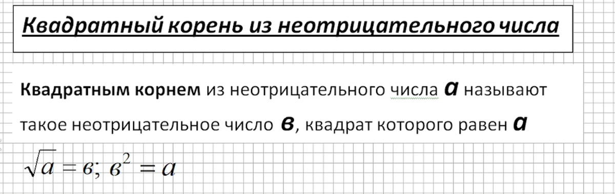 Квадратный корень из неотрицательного числа (арифметический квадратный корень) — это неотрицательное число, квадрат которого равен данному числу. Обозначается как √a (читается: «квадратный корень из a»). Число a называется подкоренным числом. Применение Квадратный корень из неотрицательного числа используется в математике и естественных науках, например: В формулах для вычисления корней квадратного уравнения. В геометрии — квадратный корень числа — это длина стороны квадрата, площадь которого равна этому числу.