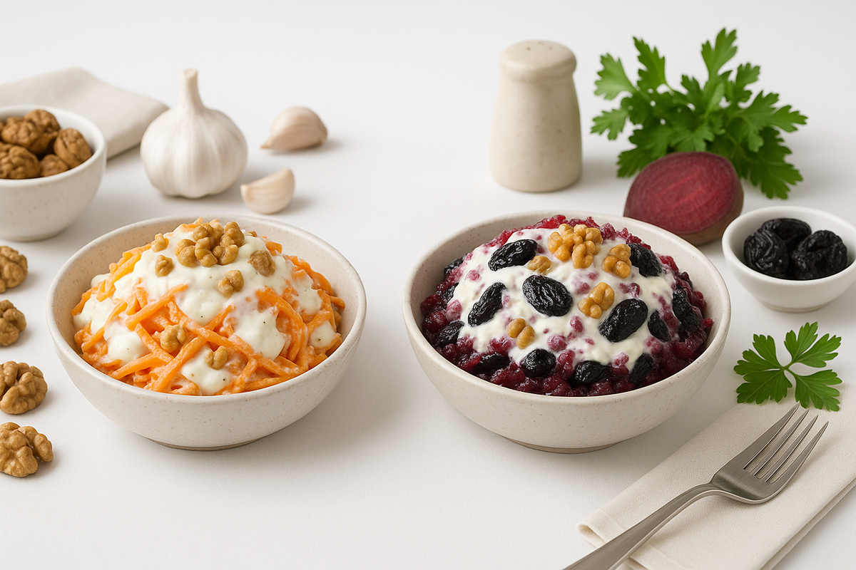 Яркая подача, глубокая керамическая тарелка, тёплый рассеянный свет, тёртая морковь с орехами на первом плане, рядом свекольный салат с мягким блеском чернослива. Атмосфера домашнего уюта и лёгкой праздности. Морковный салат с орехами и чесноком БЖУ на 100 г: белки 2.1 г, жиры 9.4 г, углеводы 7.3 г Ингредиенты: • морковь 300 г • грецкие орехи 40 г • чеснок 1 зубчик • сметана 2 ст. л. или йогурт • щепотка соли Приготовление: Тру морковь на средней тёрке. Орехи слегка подсушиваю на сухой сковороде — так вкус становится значительно ярче. Нарезаю их крупно, чтобы текстура чувствовалась. Чеснок давлю, вмешиваю сметану ( я беру 1: 1 майонез и сметану), соль. Соединяю всё в одной миске, даю салату постоять 10 минут, чтобы сливочная заправка собралась с соком моркови и стала насыщеннее. Свекольный салат с черносливом и орехами БЖУ на 100 г: белки 2.3 г, жиры 8.7 г, углеводы 9.1 г Ингредиенты: • отварная свекла 300 г • чернослив 6–8 штук • грецкие орехи 40 г • йогурт или сметана 2 ст.