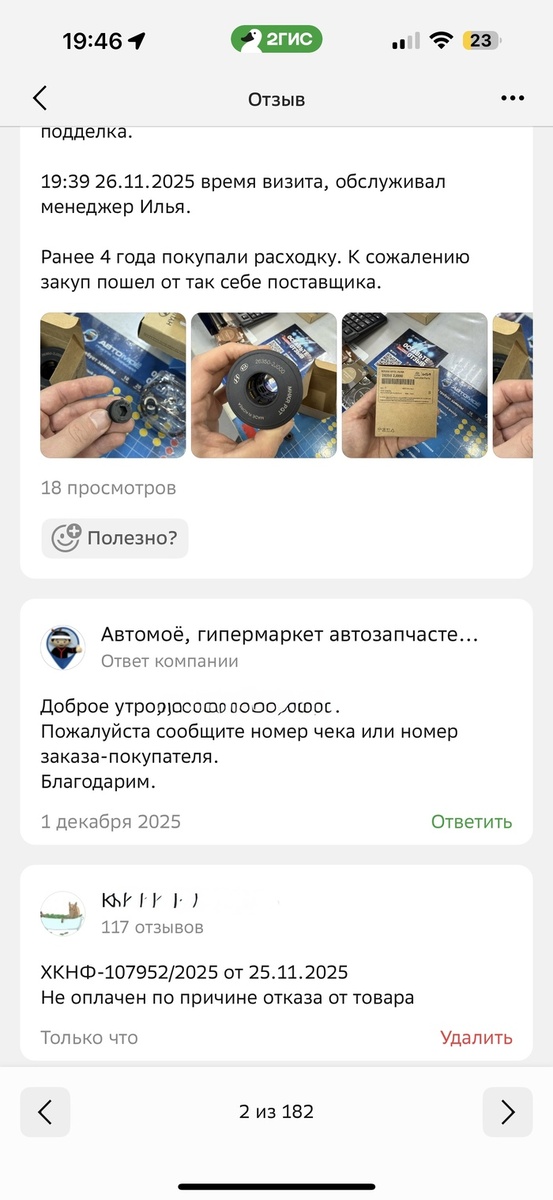Пермь, сеть Автомое. Магазин на Островского. Ребята в принципе хорошие, федералы и крупно ведут свою деятельность. Расходку для то покупали всегда у них, был оригинал без вопросов. И недавно заказал снова детали для то и привезли паль. На 2 машины паль. Поддельные масляные фильтры, а это на секунду, риск встрять на убитый двигатель. Разумеется автомое будет все отрицать и это не они. Связался в телеге, попросили телефон. И оставил отзыв в 2гис, чтобы булки не расслабляли и не забивали до решения проблемы. Разумеется никто не позвонил. А отзыв в 2гис решили по известной схеме удалить! Потому что ответ на отзыв был в форме вопроса. Чего ждал? Люлей поставщику и отзыв партии, сообщения в духе «спасибо тс за внимательность, мы засунули все поддельны запчасти в нужное место поставщику и готовы вас пригласить за покупками оригинала». Но эффективная сова решила, что проще бороться с отзывом. И ухреначить сотни движков поддельными запчастями. Пост автора dec300z. Читать комментарии на Пикабу.