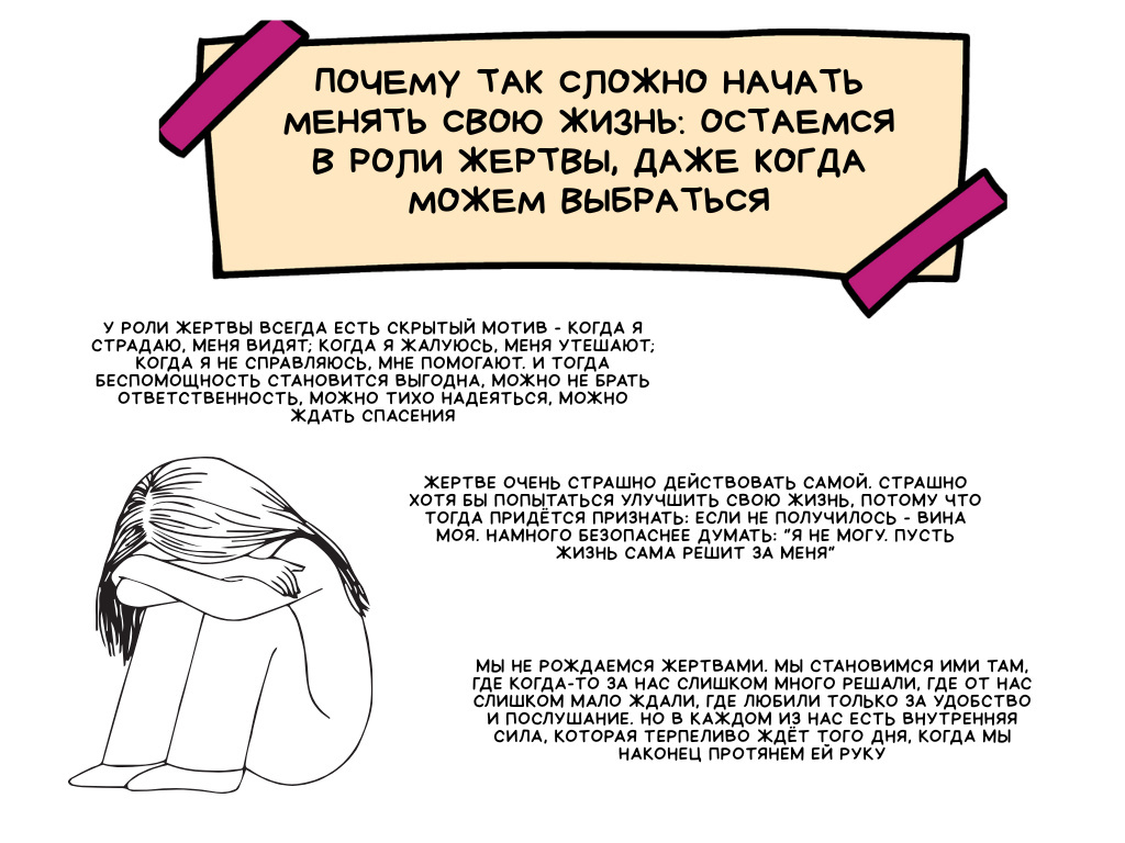 не нужно сталкиваться с возможным отказом. У роли Жертвы всегда есть скрытый мотив - когда я страдаю, меня видят; когда я жалуюсь, меня утешают; когда я не справляюсь, мне помогают. И тогда беспомощность становится выгодна, можно не брать ответственность, можно тихо