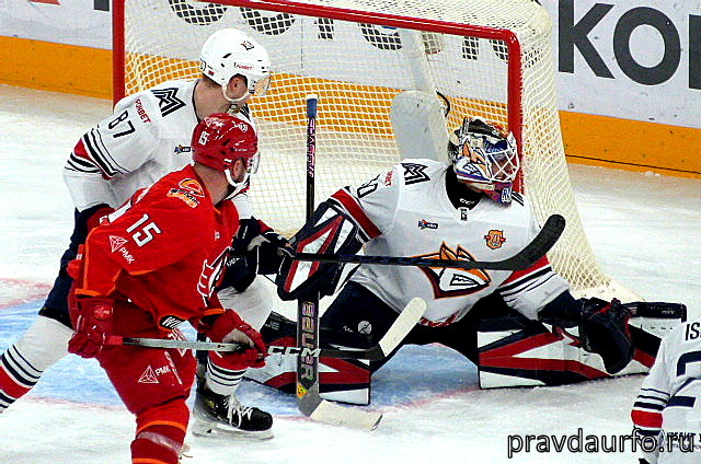 Хоккеисты «Автомобилиста» в домашнем матче чемпионата КХЛ принимали в Екатеринбурге магнитогорский «Металлург». Игра получилась насыщенной на события, а развязка – исключительно драматичной. Совсем недавно, 20 ноября, команды уже встречались на льду «УГМК-Арены». Результативный матч завершился победой «сталеваров». Перед екатеринбуржцами стояла задача взять реванш, а магнитогорцы явно рассчитывали укрепить лидерство в Восточной конференции. «Автомобилист» мог забить уже в первой атаке, но шайба миновала ворота Ильи Набокова. Впрочем, этот момент долгое время оставался единственным. Соперники катались в гости друг к другу, но бросков в створ явно недоставало. Только ближе к концу первого периода команды обменялись стопроцентными моментами. Хозяева не забили при выходе два в одного, и тут же Евгений Аликин выручил екатеринбуржцев. На 17-й минуте произошел едва ли не самый яркий эпизод отрезка. В кулачном бою сошлись екатеринбуржец Роман Горбунов и магнитогорец Роман Канцеров. Форвард «Ав