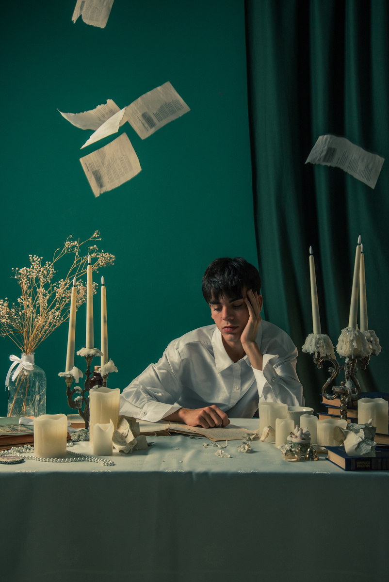 Когда мы придумывали эту фотосессию, захотелось представить, каким бы был наш герой, окажись он в эпоху Есенина или Достоевского. Возможно, он тоже писал бы строки, которые читают и сегодня — полные эмоций, размышлений и скрытой страсти. Атмосфера зала Flat, тщательно подобранная музыка и великолепная модель помогли передать дух того удивительного времени — эпохи вдохновения, глубины и настоящих человеческих чувств. Каждый кадр словно переносит зрителя в прошлое: мягкий свет студии отражается в зеркалах, винтажные детали интерьера создают ощущение, что мы заглянули в другую эпоху, где каждое мгновение наполнено смыслом. Модель воплотила образ героя, живущего внутренним миром, полным противоречий и эмоций. Взгляд, позы, лёгкая игра с реквизитом — всё это превращается в маленькую историю о человеке, который существует между строк своих мыслей и чувств. Свет и тени зала Flat создают драматизм, подчёркивают черты лица, придают кадрам кинематографичность. Каждое движение, каждый взгля