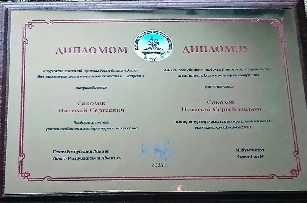 В этом году я третий раз стал Лауреатом Именной Премии! Сегодня я был удостоен стать лауреатом Именной Премии Республики Адыгея для лиц с ограниченными возможностями здоровья. На этот раз «За достигнутые успехи области искусства и литературы». 3 декабря отмечается Международный День инвалидов. Этот день призван обратить внимание на людей с инвалидностью, на их проблемы, на то, как их решать, и как интегрировать людей в общество. Ведь не смотря то, что на дворе 21 век, проблемы Доступности полноценной жизни для инвалидов, всё ещё существуют. На торжественном мероприятии в Доме Правительства, Глава Республики Адыгея Мурат Каральбиевич Кумпилов поздравил всех лауреатов Премии с наградами за достижениями в разных областях – творчества, литературы, спорта, учёбы и общественной жизни. — Ваши личные истории вдохновляют. Они показывают, как много может достичь человек, который верит в себя и не останавливается ни перед какими трудностями. Ваша целеустремленность и успехи заслуживают огромного
