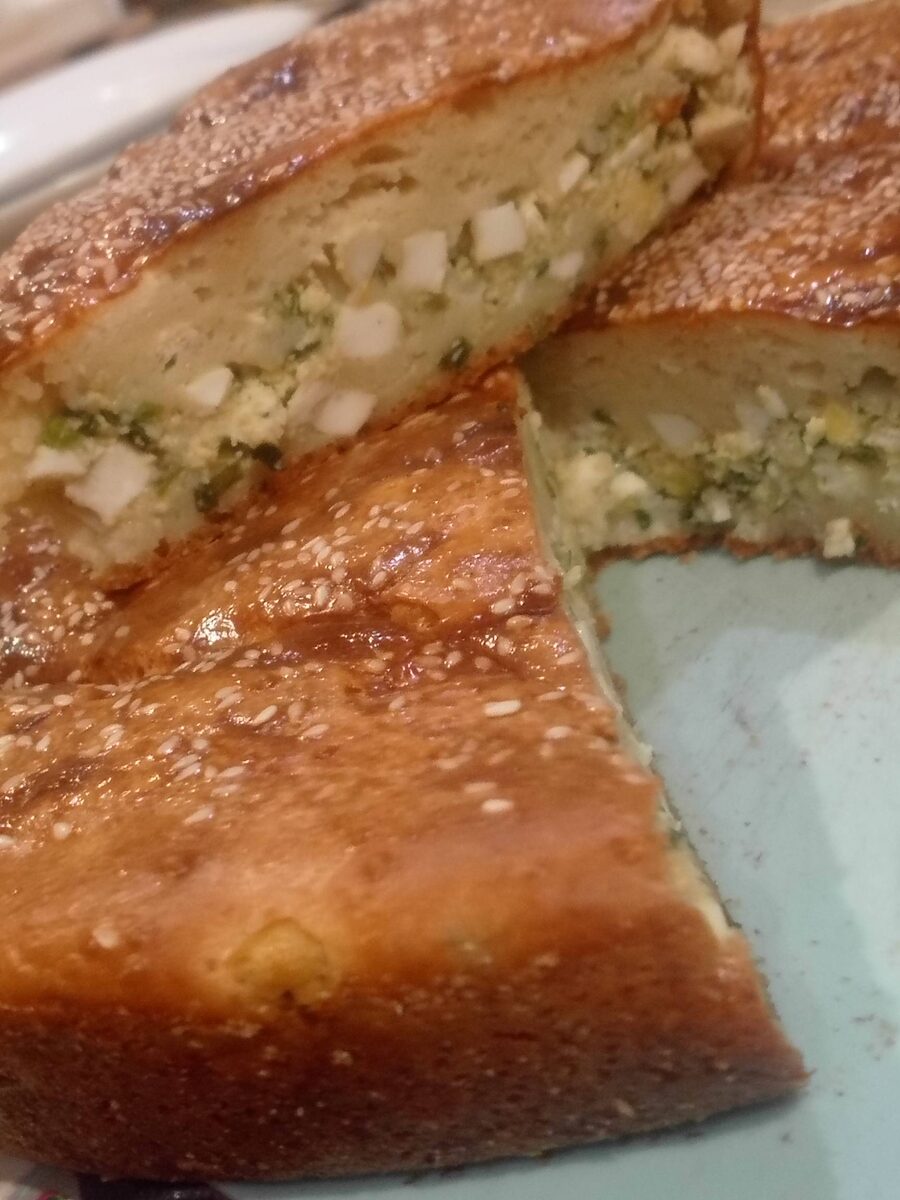 Сытное блюдо, легкое в приготовлении. Любители пирожков с яйцами и луком очень понравится. Прекрасно подходит к ужину со сладким чаем. Ммммммм....пальчики оближешь. Простота приготовления заключается в заливке начинки тестом о чем говорит название пирога. Заливные пироги готовят с капустой, с рыбой, с курицей, с мясом, с овощами, с грибами и сладкие. Тут дело вкуса хозяйки. Сегодня с яйцами! Разберемся с ингредиентами: Конечно яйца С0— 10 шт. в крутую и 5шт. в тесто; Лук зеленый перья — 200 гр.; Кефир — 300 мл.; Сметана — 200 гр. и 2 ст.л.; Мука пшеничная — 300 гр.; Сода — 10 гр.; Панировочные сухари — 1 ст.л.; Кунжут — 1 ст.л.; Соль, перец — по вкусу, растительное масло для смазывания формы. Подготовим ингредиенты. 10 яиц помыть и сварить в крутую. Если яйца С0 варите 11-12 минут после закипания воды. Лук нарезаем в кольцо 5 мм. Кефир, яйца для теста заранее достаем из холодильника. Все должно быть комнатной температуры (возьмите себе за правило). Муку просеять. Начинка. Лук не мног