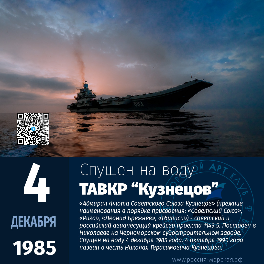 40 лет - 1985, 4 декабря: Первый советский авианосец - тяжелый авианесущий крейсер (ТАКР) «Леонид Брежнев» был торжественно спущен на воду. См. также: Спущен на воду первый советский авианосец Отечественная морская история: Памятные и юбилейные даты декабря 2025 года.
