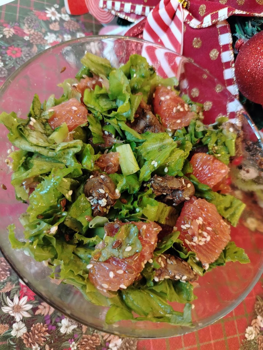 Салат получается легким за счет большого количества зелени и отсутвием майонеза. Данное блюдо можно назвать диетическим за счет большого количества витаминов содержащихся в продуктах. Ингредиенты Листья салата 100 грамм ( 1 горшочек) Грейпфрут 1 штука Печень курина 150 грамм Семена льна 1 ч.л. Кунжут 1 ч.л. Масло оливковое 1 ст.л. Приготовление Грейпфрут очистить порезать на небольшие кусочки. Печень индейки очистить от прожилок и порезать на кусочки. Переложить в разогретую сковороду, добавить соль по вкусу и потушить около 15 минут до готовности. Листья салата нарезать на части. Собираем салат. В миску опускаем листья салата, подготовленный грейпфрут, готовую печень, семена, и оливковое масло хорошо перемешиваем. Салат готов. Приятного аппетита!