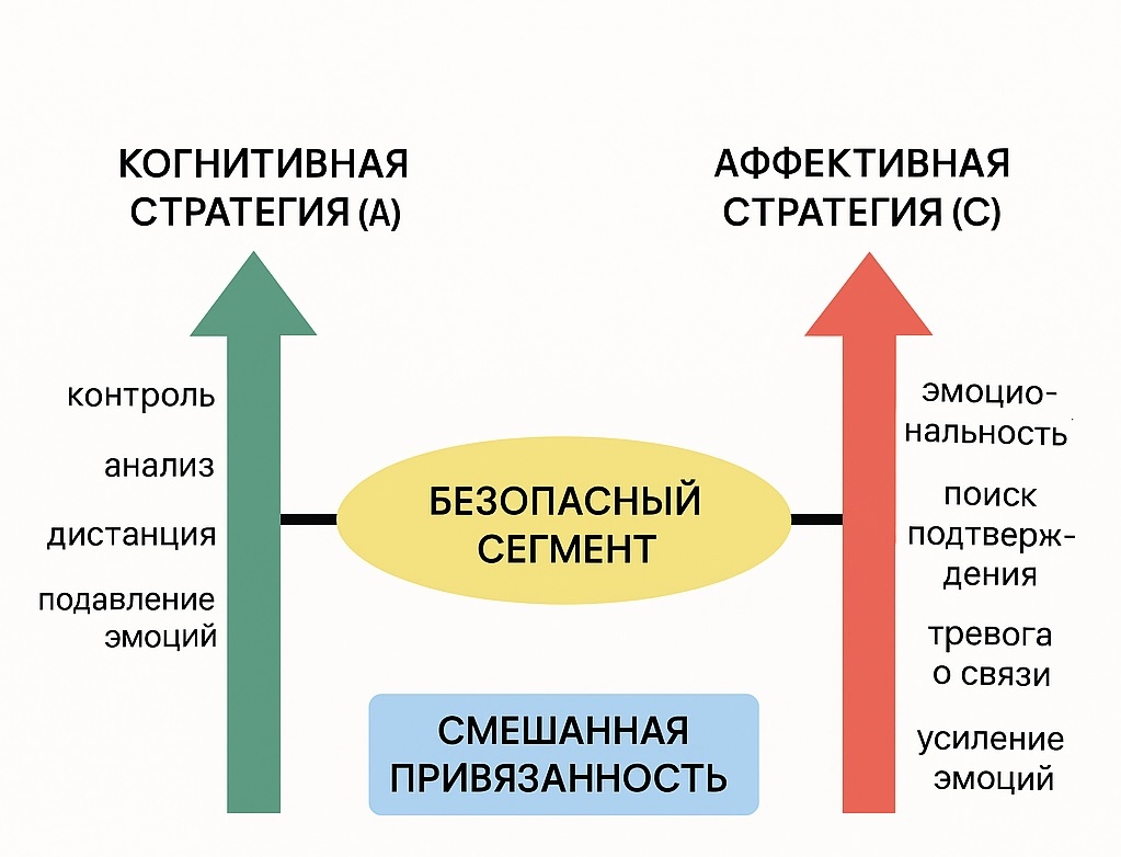 Динамическая модель созревания привязанности (DMM) выделяет две основные защитные стратегии: Вектор стратегии А, стратегии подстройки. Здесь логика важнее эмоций. Когнитивный компонент, подавление эмоций, контроль, анализ являются ведущими способом восстановить контакт со значимым взрослым. Такие дети замирают, обдумывают, подавляют, подстраиваться. Они не чувствуют свои потребности, но очень хорошо считывают потребности других людей. Стратегии вектора А развиваются, когда эмоции ребёнка не встречают отклика, сколько бы ребенок ни кричал, ни плакал, ни проявлял себя эмоционально - все бесполезно. А вот если он подойдет с заботой, успехом, со стаканом после похмелья родителя, положительной оценкой - он становиться заметным. И по мере нарастания стратегии А, возникает еще большее подавление эмоций, еще большая подстройка под взрослого до парантификации (когда ребенок и родитель меняются ролями). Очень часто этот вектор стратегии наблюдается в семьях, где был взрослый, за которым нужен бы