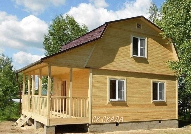 На фото утеплённый каркасный дом с мансардой и ломаной крышей, цены для размера 6х6 м + веранда 2х6 м за тёплый контур с отделкой