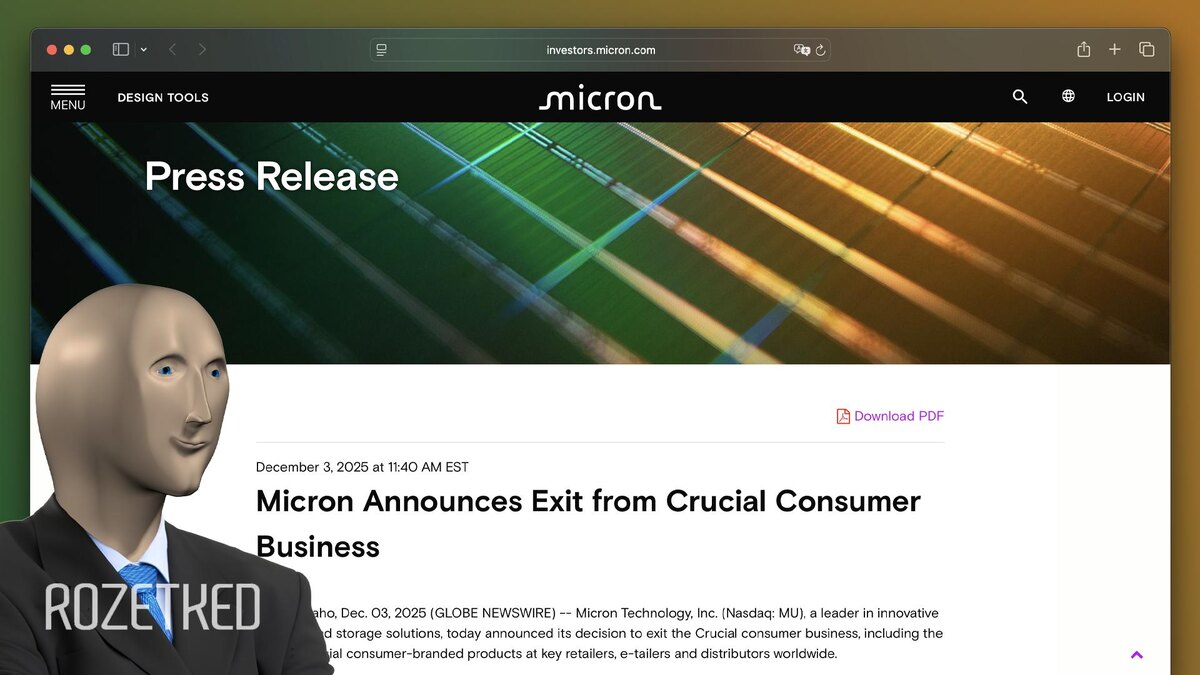 В ответ на пост Светлая память... памяти Кризис памяти продолжает набирать обороты. Micron, один из крупнейших производителей ОЗУ, объявил об уходе с потребительского рынка. Компания отказывается от бренда Crucial. Теперь Micron сфокусируется на дата-центрах для ИИ. Поставки на потребительском рынке прекратят к февралю 2026 года. Из крупных игроков на рынке останутся Samsung и SK Hynix. rozetked.me/news/43093