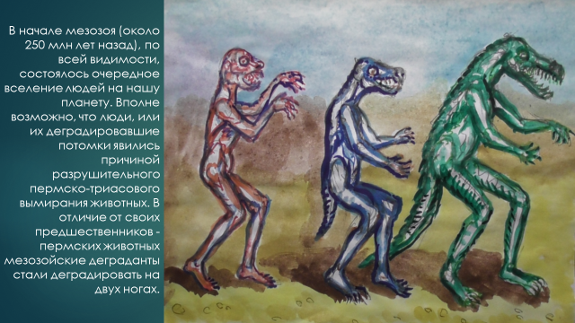 u В начале мезозоя (около 250 млн лет назад), по всей видимости, состоялось очередное вселение людей на нашу планету. Вполне возможно, что люди, или их деградировавшие потомки явились причиной разрушительного пермско-триасового вымирания животных. В отличие от своих предшественников - пермских животных мезозойские деграданты стали деградировать на двух ногах.