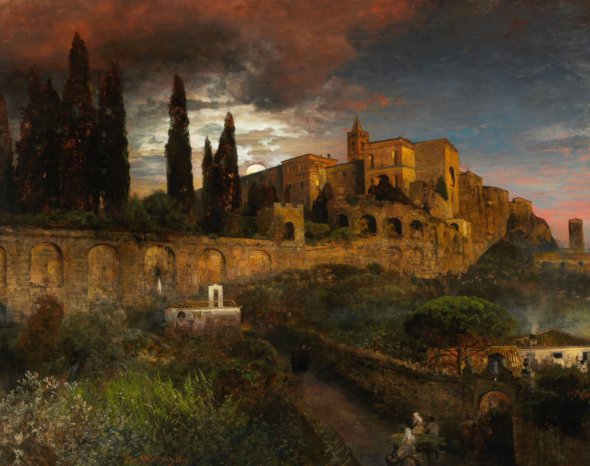 Освальд Ахенбах (1827-1905) считался одним из ведущих пейзажистов Германии своего времени. Он и его старший брат Андреас, также пейзажист, были последними яркими представителями дюссельдорфской школы живописи. Первый визит Освальда в Италию в 1845 году определил тематику его картин почти на всю жизнь. Он с удивительной чуткостью сочетал элементы жанровой и пейзажной живописи, передавая разнообразные атмосферные эффекты. Его тщательно выполненные картины, изображающие знаменитые итальянские деревни, города и повседневную жизнь, пользовались огромной популярностью у буржуазии. Окруженная кипарисами вилла д’Эсте в Тиволи появляется в нескольких композициях Ахенбаха, начиная с 1850-х годов. Краска нанесена толстыми слоями, что характерно для его позднего, зрелого стиля, с акцентом на контрастные цвета. На переднем плане изображена бытовая сцена: два крестьянина на ослах и несколько монахов. Южная стена мрачной виллы эпохи Возрождения возвышается над концом аллеи, окаймлённой пышной