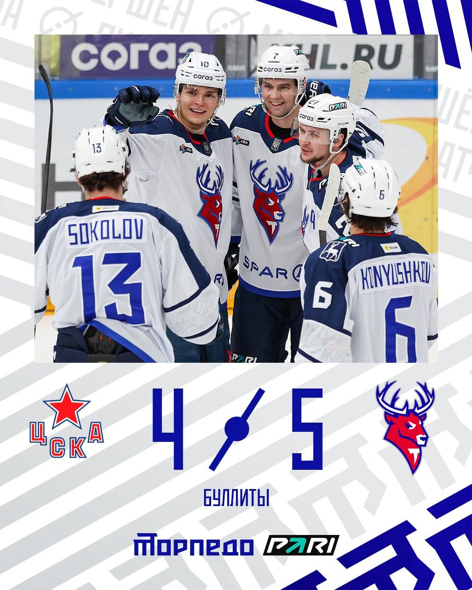 Добрый вечер, дорогие друзья! Мы продолжаем следить и переживать за нижегородское Торпедо, которое сегодня в рамках регулярного чемпионата продолжало свои московские «гастроли» матчем с ЦСКА. Встреча началась с ошеломительных атак армейцев. Спустя 3 минуты это дало свои плоды - счет был открыт хозяевыми. Кошмарные события из двух предыдущих встреч как будто стали переходить и на этот матч. Но Торпедовцы смогли забрать шайбу и контроль над игрой. К сожалению, в первом периоде своих плодов это не дало. Но дало во втором! Сначала ближе к середине периода Владислав Фирстов поразил ворота Александра Самсонова, а на экваторе матча, спустя 15 от начала розыгрыша большинства отличился Максим Летунов, грамотно сыграв на пятаке. Большинство сработало, но оно же сработало и у ЦСКА под занавес второго периода. Итог 2:2 после 40 минут игры. Третий период начался идентично первому - через 3 минуты от стартового вбрасывания хозяева выходят вперед в матче. В этот раз автозаводцам удалось добраться н