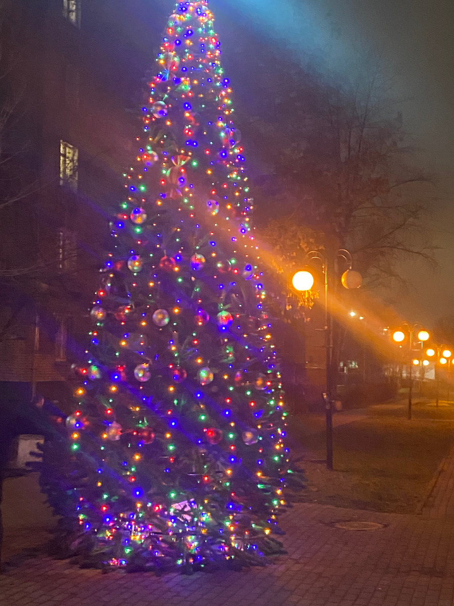 В Люберцах по-прежнему замечательная погода, зима задержалась где- то, ха-ха… «А мне и больно хорошо, а мне и замечательно…» Именно эту фразу я позаимствовала у моей землячки, вот очень она уместна сейчас для меня при выходе на улицу. А сегодня с супругом снова ходили в Люберецкий центральный парк. И сколько всего сверкающего по дороге встретили ! Конечно, в первую очередь порадовали елки! Вот первая. Это почти у дома. Днем она очень плохо смотрится. Скучная , мрачная стоит, украшенная стандартными шарами четырех цветов. Шары расположены ровными рядами. Хотя ряды потихоньку пропадают, ведь шаров с каждым днем все меньше и меньше, народ- то с пустыми руками не уходит от елки😬. А вечером елка намного красивей выглядит! А вот это центральная! Хотела супруга попросить меня сфотографировать между Дедом Морозом и Снегурочкой. Но он так азартно катал свою радиоуправляемую машинку😆. Я уж его не стала отрывать от своего увлечения. А вот следующая такая необычная, правда? Она с