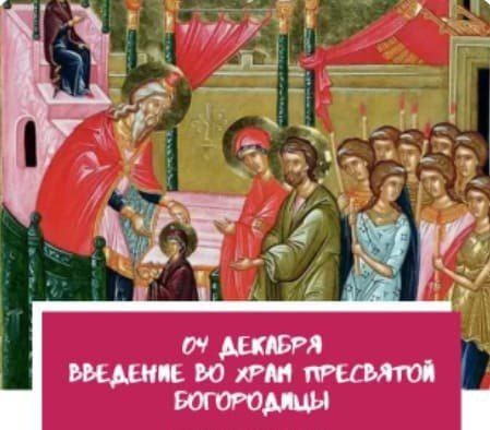 Всем здравствуйте, хочу вам рассказать о том, что 4 декабря празднуется очень большой православный праздник. Введение во храм пресвятой богородицы. Это праздник двунадесятый. То есть, это говорит о том, что дата праздника не меняется никогда. Об этом празднике в православии, в принципе, Вы можете прочитать в Википедии. Я не буду вам рассказывать, пересказывать то, что написано на 10 страницах. Я просто хочу вам рассказать какие-то интересные моменты, которые в Википедии вы не найдете. Ну, во-первых, у родителей Пресвятой Богородицы у Анны и Иоахима очень долгое время не было детей. Жили они, вы понимаете, на земле Израиля, то есть женщины там молились отдельно от мужчин х и доходило даже до того, что когда Анна приходила к храму молиться о том, чтобы Бог даровал ей ребенка, на неё остальные женщины просто прямо косо смотрели, отходили, не хотели молиться рядом с ней, потому как в то время считалось, что, если Бог не дает им ребенка, то это она несет какую-то особенную божествен