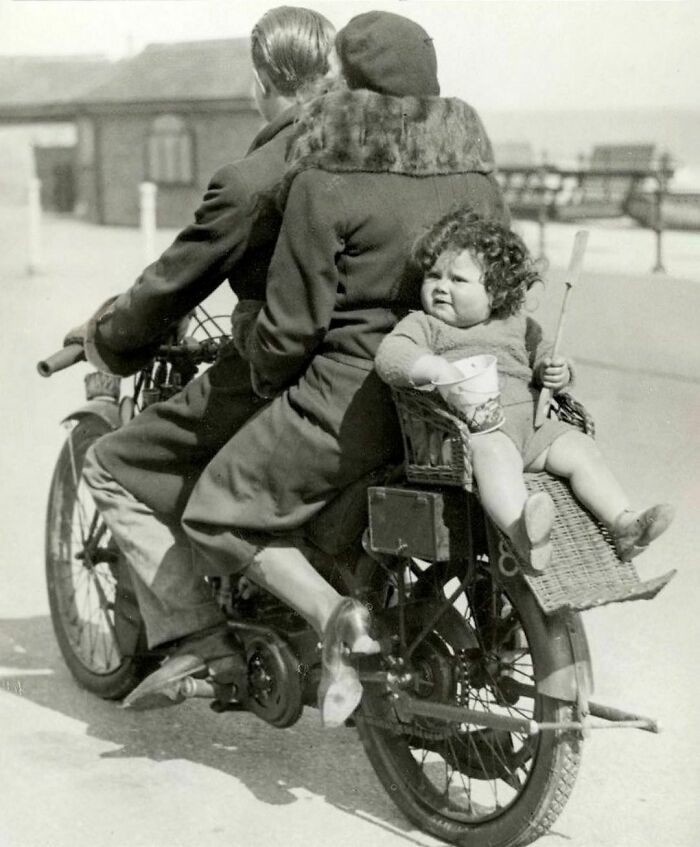 На старинной фотографии запечатлён момент, который заставляет задуматься о безопасности детей в прошлом. Что мы видим на снимке: Мотоцикл с багажником, на котором сидит маленький ребёнок. Отсутствие защиты: малыш совершенно не зафиксирован и может легко упасть. Невнимательные родители: взрослые не следят за ребёнком, что создаёт дополнительную опасность. Несоответствующая одежда: в то время как родители одеты по погоде, ребёнок находится в лёгкой одежде, что говорит о своеобразных методах закаливания того времени. Исторический контекст: В 1930-х годах в Великобритании существовала особая система воспитания детей, включающая жёсткие методы закаливания. Мальчики носили шорты даже в холодное время года, а девочки редко надевали колготки. Однако такие практики часто приводили к пренебрежению элементарными мерами безопасности. Современные выводы: Этот снимок — яркий пример того, как изменились наши представления о безопасности детей. Сегодня мы понимаем, что забота о здоровье должна соче