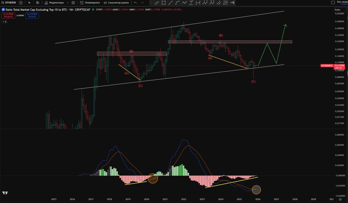 График топ 10 альтов к битку (без учёта стейблов). Формируется глобальная дивергенция. Думаю в этом цикле ожидать перехая не стоит, но хороший отскок до волны (B) вполне возможно. Это может произойти на фоне роста бтс к 110k. Там же буду сокращать портфель, и перезаходить в конце 2026. Такая модель подходит, и под циклы бтс, и под QT от фрс, и под небольшую эйфорию в виде альтсезона. На этом отскоке не буду продавать полностью всю сумку, буду смотреть по ситуации. Так как рост BTC к 200к+ всё ещё допускаю, хоть и 4х летний цикл (о котором все знают) подошёл к концу. Но пока эта модель мне видится наиболее реальной.
