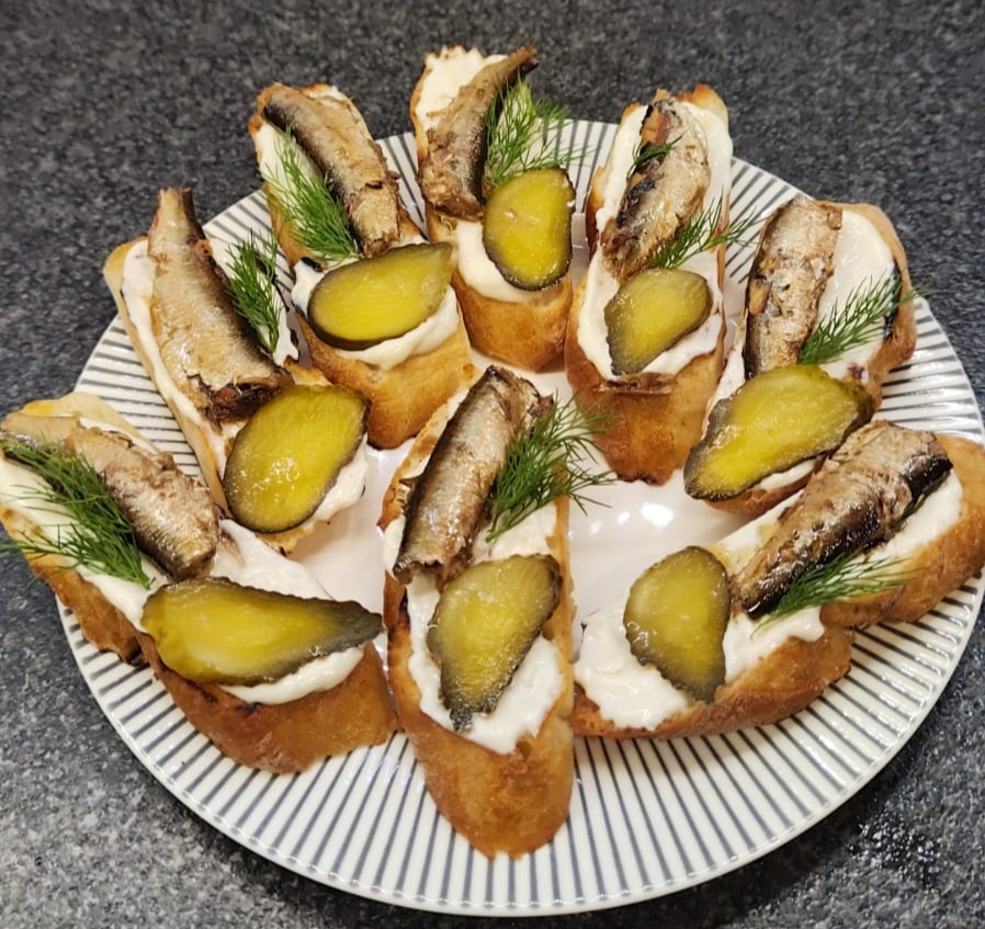 Эти бутерброды можно ставить на праздничный стол, вкусно и красиво . ИНГРЕДИЕНТЫ: Багет Шпроты Огурцы маринованные Майонез Чеснок ПРИГОТОВЛЕНИЕ : Багет нарезать наискосок ломтиками толщиной 0,6 см. Подсушить их на сковороде или в тостере. Чеснок почистить,измельчить, добавить в майонез, размешать. Регулируйте количество чеснока по своему вкусу. Открыть шпроты, нарезать огурчики слайсами. Каждый подсушенный ломтик багета намазать чесночным майонезом, положить сверху шпроты и огурчик,можно украсить зеленью. ПРИЯТНОГО АППЕТИТА !