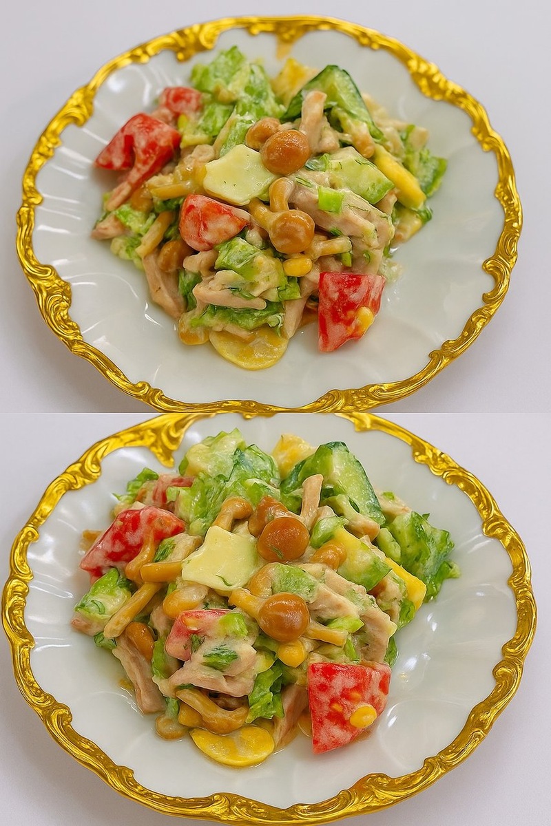 Быстрый, сытный и очень вкусный салат, который выручит в любой ситуации! Сочетание копчёного мяса, грибов и свежих овощей — это всегда удачно. Обязательно попробуйте — готовится за считаные минуты! ИНГРЕДИЕНТЫ: ✅ Огурцы — 2 шт. ✅ Помидоры — 2 шт. ✅ Листья салата — 1 пучок ✅ Яйца — 3 шт. ✅ Опята (маринованные) — 250 г ✅ Копчёное мясо — 400–500 г ✅ Майонез — 150 г ✅ Соль, специи, лимонный сок — по вкусу ПРИГОТОВЛЕНИЕ: 1. Яйца отварите и нарежьте кубиками. 2. Огурцы, помидоры и копчёное мясо нарежьте. 3. Листья салата порвите руками. 4. Грибы откиньте на дуршлаг, дайте стечь маринаду. 5. Смешайте все ингредиенты в глубокой миске, добавьте майонез, лимонный сок, соль и специи. Перемешайте. ПРИЯТНОГО АППЕТИТА!
