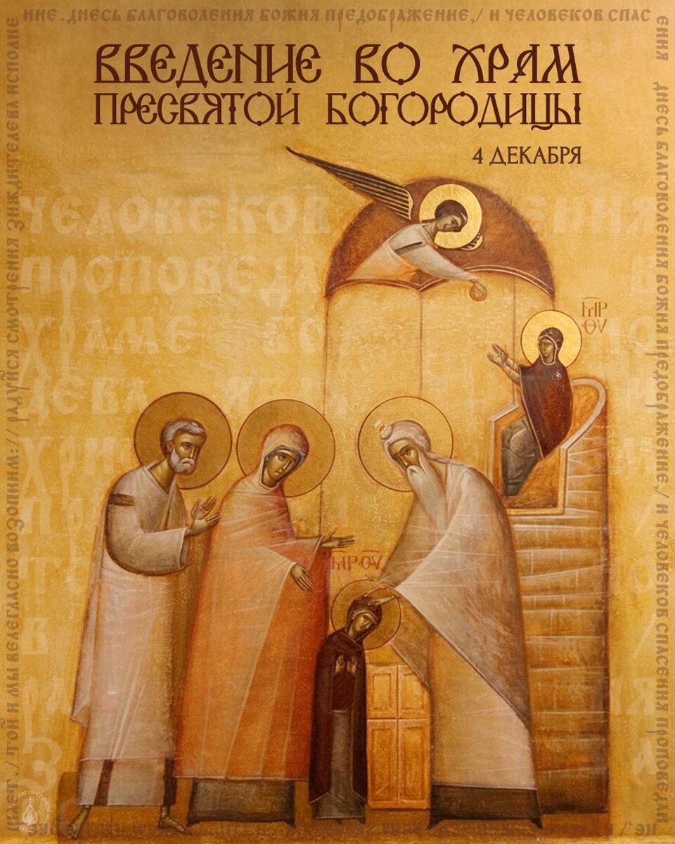 4 декабря - двунадесятый праздник ВВЕДЕНИЕ ВО ХРАМ ПРЕСВЯТОЙ ВЛАДЫЧИЦЫ НАШЕЙ БОГОРОДИЦЫ И ПРИСНОДЕВЫ МАРИИ. Родители Пресвятой Богородицы, праведные Иоаким и Анна, ранее поносимые всеми за бездетность, но смиренно это переносившие, рождение дочери восприняли как дар Божий и посвятили дитя Богу. В трехлетнем возрасте Мария была введена во храм. По особому откровению, объятый священным восторгом, первосвященник Захария (отец Пророка и Крестителя Господня Иоанна) ввел Ее во Святая Святых, куда имел право входить только сам первосвященник лишь один раз в год. В храме Пречистая Дева Мария оставалась до 12 лет, где дала необычный для Ветхого Завета обет - сохранить девство. С ПРАЗДНИКОМ, дорогие братья и сестры! 🕊Искренняя сердечная молитва друг о друге призывает благодать Божию, которая исцеляет наши души. 🙏Если Вам или Вашим близким сейчас нужна молитвенная поддержка - оставьте записку с именами на нашем сайте по этой ссылке.