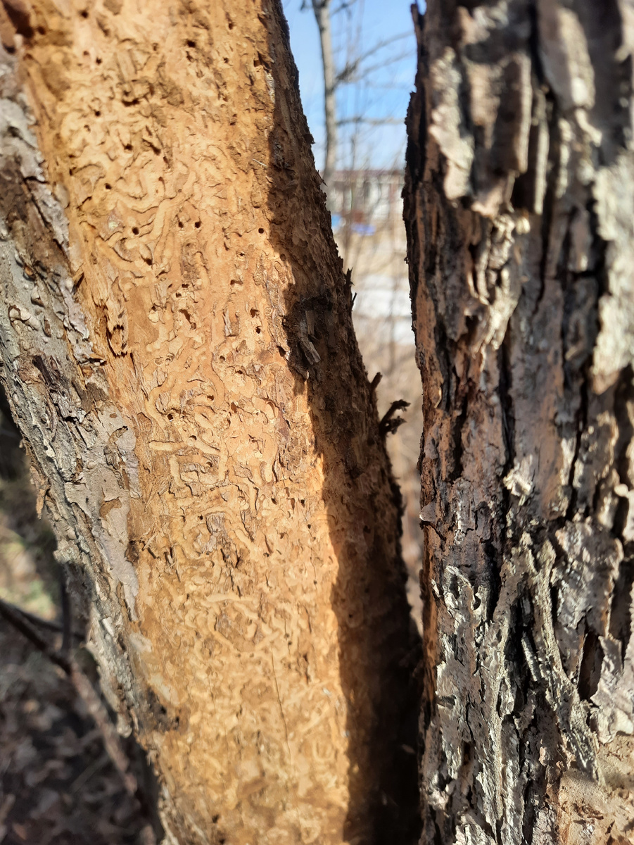 После обрезки яблонь осенью 2024 года, обнаружила на коре отверстия не далеко от места обрезки, кора стала сохнуть и отходить от древесины, что это может быть и как с этим бороться?