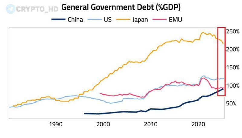 🤑 Глобальный печатный станок. ➤ Страны с крупнейшими экономиками все в долгах. ➤ Соотношение госдолга Японии к ВВП составляет 215%, США – 125%, Еврозона – 95%, Китай – 93%. ➤ За последние 10 лет этот процент удвоился. Глобальный долговой кризис реален (The Kobeissi Letter) ➤ При крупных долговых кризисах часто запускают масштабное смягчение денежной политики (включают печатный станок), чтобы дать системе ликвидность, не допустить массовых дефолтов и удержать экономику от обвала. Crypto Headlines