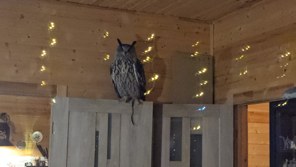 Сова филин Ёль в доме отдыхает от сырой погоды. Кошка Морошка следит за порядком, пока я всех кормлю