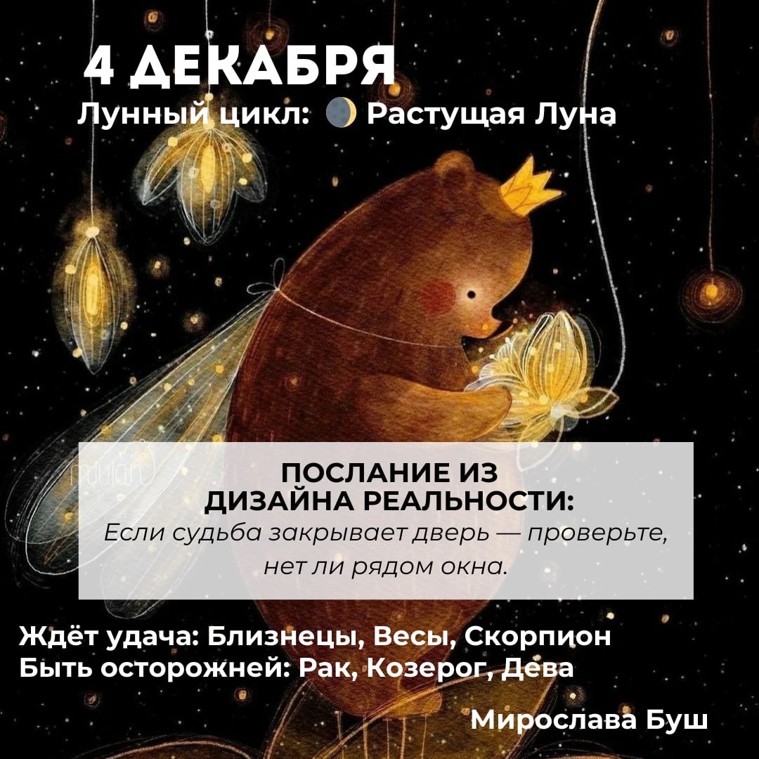 4 декабря РЕКОМЕНДАЦИИ: ✨ Сделайте сегодня что-то “слишком красивое” просто так. Украсьте рабочее место, накройте завтрак как для гостей, наденьте что-то праздничное без повода. Красота усиливает уверенность. 🎧 Выберите песню дня. Та, что задаст настроение. Включайте её, когда хотите поймать свою “правильную волну”. 🌱 Добавьте в день что-то маленькое, что вы обычно откладываете. Полить растение, разобрать полку, обновить фото на заставке — маленькие действия удивительно двигают жизнь вперёд. ✉ Подписаться на Мирославу