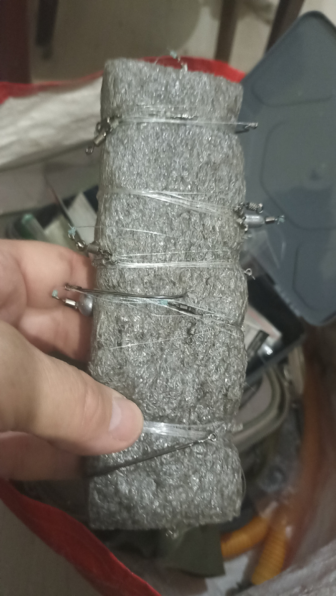 Световой день короткий, поэтому решил собраться с вечера, наготовив своих отводных оснасток, что б не вязаться на месте при обрывах. Кстати, давно не использую мотовила, а беру для оперативного хранения монтажей кусок вспененного упаковочного материала. Не знаю название его, скорей всего пенопласт, но может и полиэтилен. В общем, такая серая упаковочная полоска. Очень удобно в ней делать отверстия, в которые вкладываешь груза, и не надо думать, как их зафиксировать, что б не болтались. И крючки легко втыкаются.
