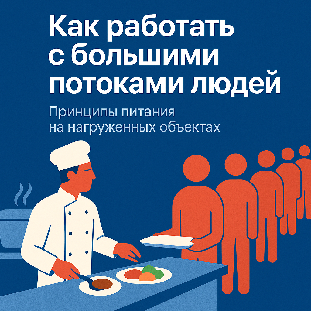 Питание на объектах с большим трафиком — одно из самых сложных направлений общепита. Речь идёт о местах, где ежедневно проходят тысячи людей: университеты, государственные учреждения, промышленные предприятия, многофункциональные офисные центры, учебные и спортивные комплексы. Главная задача — обеспечить скорость, стабильность, предсказуемое качество и безопасность. И здесь работать как обычное кафе невозможно — нужна промышленная организация питания. Ниже — ключевые принципы, без которых большие объекты начинает «вести» уже через пару часов пикового трафика. 1. Разделение потоков — студенты отдельно, сотрудники отдельно, горячее отдельно от холодного Правильная планировка — это не дизайн, а производственная необходимость. На нагруженных объектах каждый лишний метр увеличивает очереди, а неверная расстановка делает раздачу узким местом. Золотые правила: горячий и холодный цех разделены, линии раздачи не пересекаются, поток тех, кто берёт только напитки/выпечку, выходит отдельн