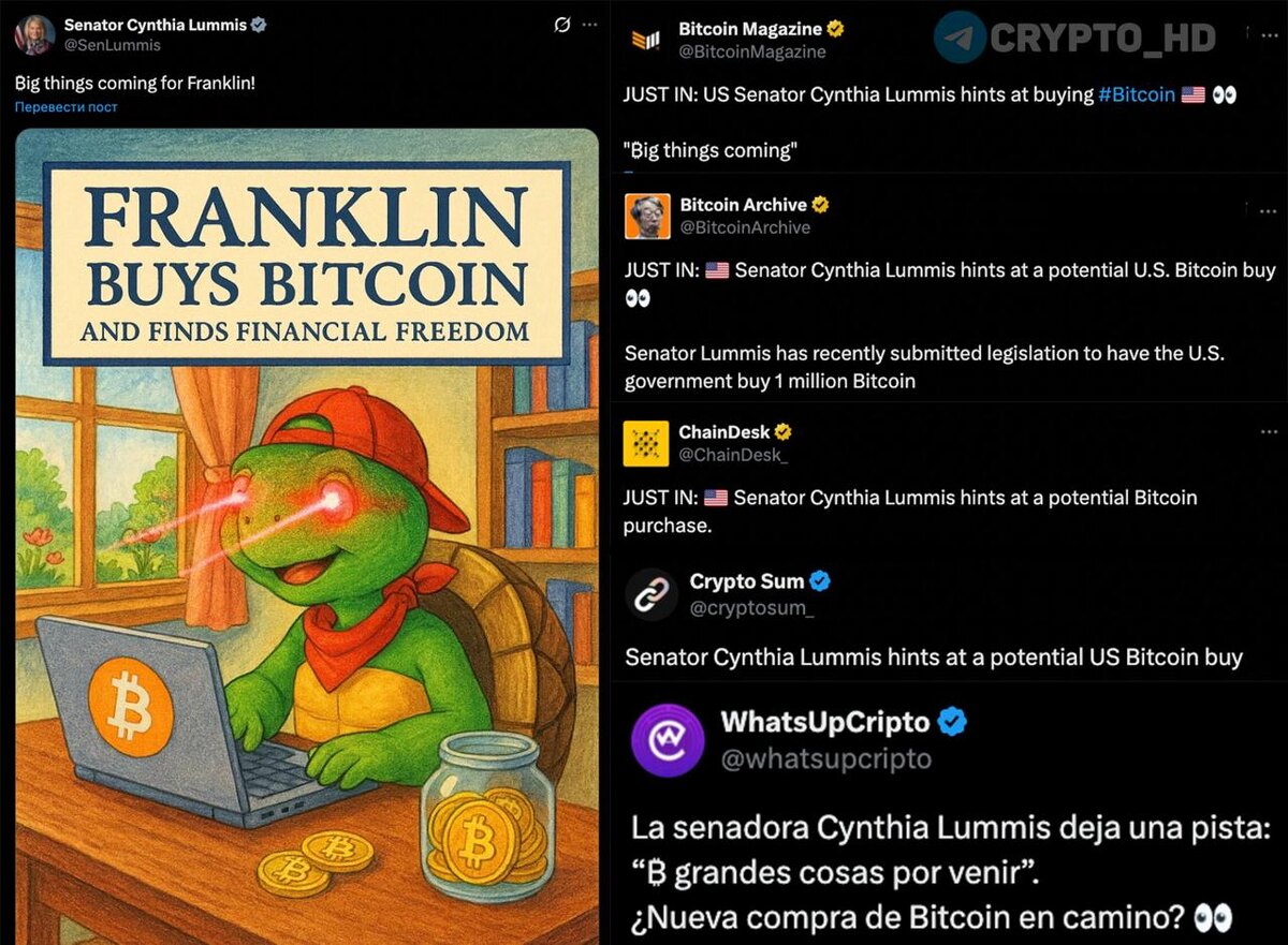 #слухи 😯 Криптаны в Twitter активно форсят слухи о том, что правительство США скоро начнет покупать Биткоин на баланс. Об этом якобы намекает новый пост сенатора США Синтии Ламмис: «₿ig things coming for Franklin!» (Франклина ждут ₿ольшие дела!) Crypto Headlines