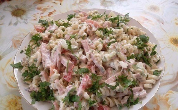 Ингредиенты: ●Макароны 200г (отварить) ●Ветчина 200г (нарезать соломкой) ●Огурцы свежие 2шт (нарезать соломкой) ●Помидоры 2шт (нарезать соломкой) ●Чеснок 2 зубчика (через пресс) ●Сыр 50г (натереть) ●Майонез ●Соль,чёрный молотый перец и зелень по вкусу. Приготовление: Все смешиваем! Салат готов)