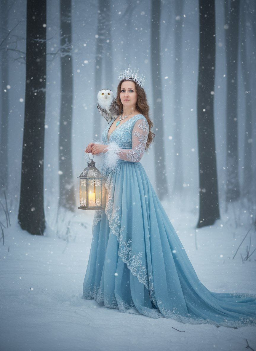 Боты NanoBanana👇👇👇 https://t.me/nanobanana_promt/23 https://dzen.ru/nanobanana_promt Не меняй черты лица Сохрани их на 100% Winter forest, snow-covered ground, frosted trees with dark trunks. Soft ambient light. Woman in icy blue gown: fitted bodice, deep V neckline, cinched waist, layered floor-length skirt with train. Sheer sleeves with frost-like lace and feathery cuffs. stands sideways, looking into the camera. Crystal necklace with glowing pendant. Silver crown shaped like icicles and snowflakes. One snowy owl on her right shoulder: white feathers with black/brown markings, yellow eyes. Makeup: pale blue eyeshadow, soft pink glossy lips. She holds ornate lantern with snowflake patterns, warm glow illuminating her face and snow. holds the flashlight at face level. foggy forest, twilight, small snowflakes visible in the air.