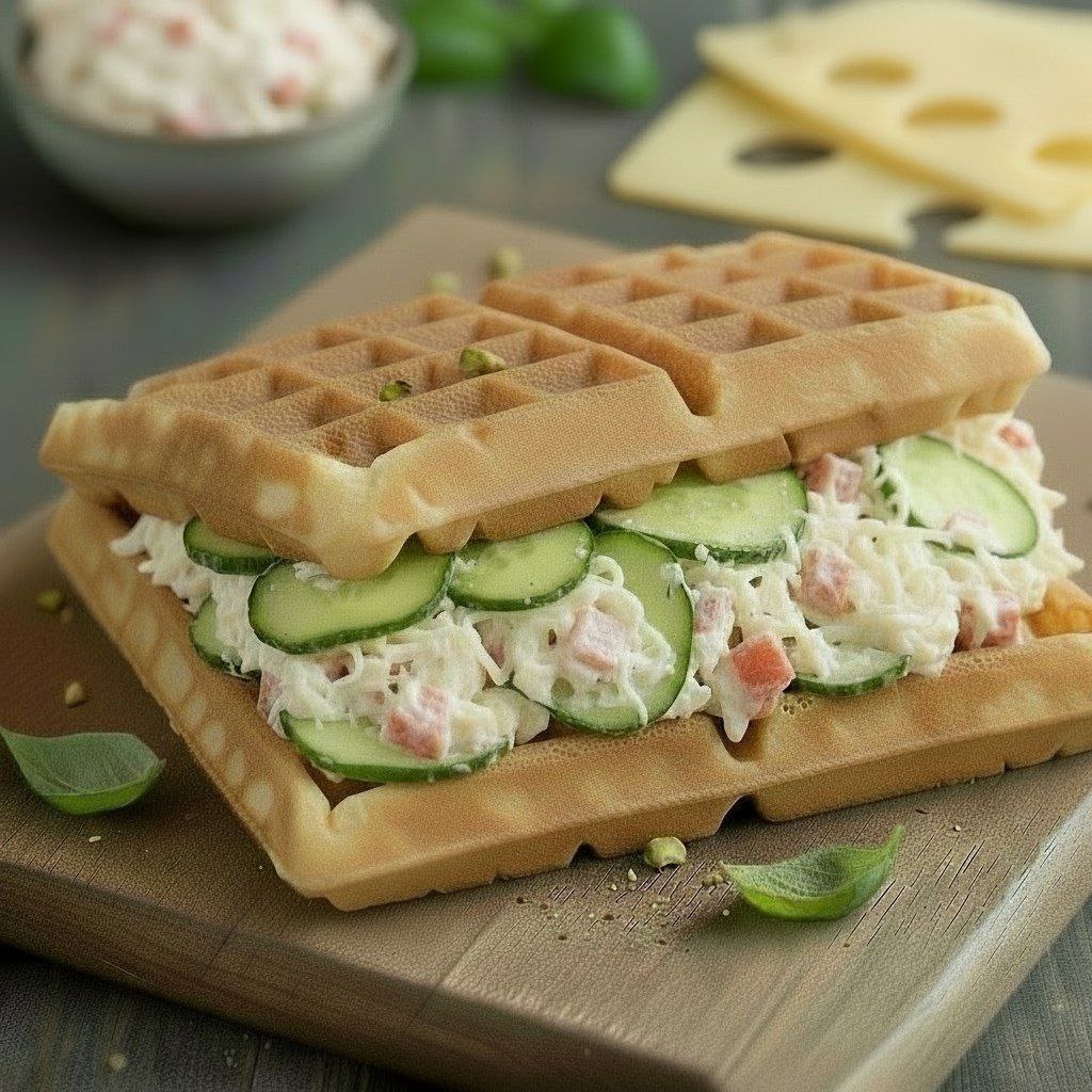 Насладитесь нашим новым предложением — вафлей с мясом краба и Швейцарским сыром! Каждый кусочек пропитан вкусом моря, а наш уникальный соус