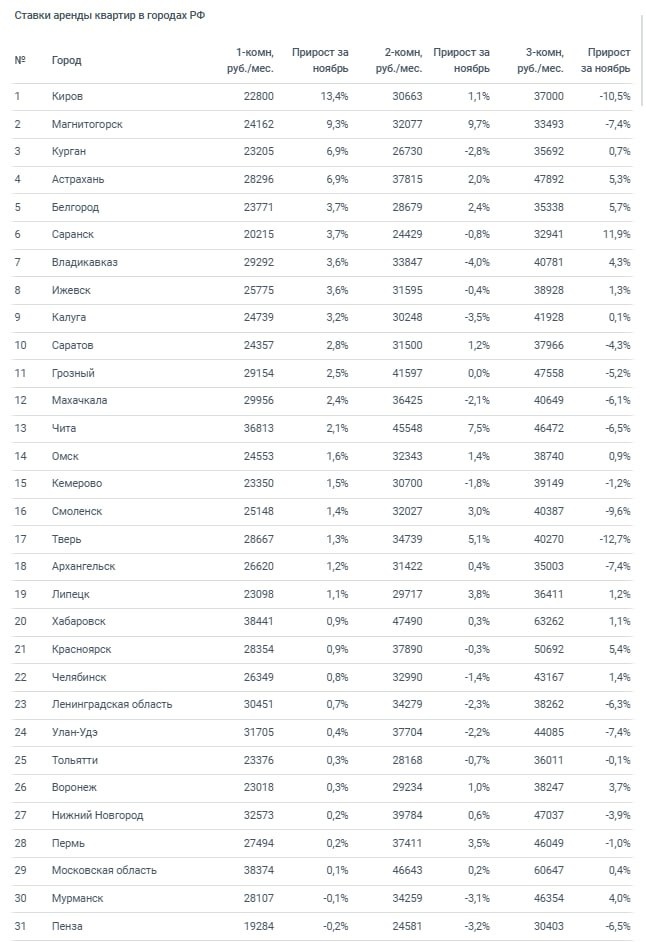 ⚡️ Перелом на рынке аренды: ставки падают уже второй месяц подряд, а инициатива перешла к арендаторам. Аналитики федерального портала «Мир Квартир» зафиксировали снижение стоимости съемного жилья в ноябре в большинстве из 70 исследованных городов России. 📉 Общий тренд: арендные ставки снизились по всем типам квартир, вернувшись к уровню августа. Средняя цена за однокомнатную квартиру по стране составила 27 774 руб./мес. (–0,5%), за двухкомнатную — 34 782 руб./мес. (–0,5%), за трехкомнатную — 43 551 руб./мес. (–0,9%). 🏙 В столицах: в Москве и Санкт-Петербурге цены на «однушки» снизились на 1,8%, а в Подмосковье — незначительно выросли (+0,1%). 📊География изменений: среди городов с наиболее заметным ростом цен на «однушки» — Киров (+13,4%) и Магнитогорск (+9,3%). Наибольшее падение зафиксировано в Брянске (–11,3%) и Курске (–6,4%). «Арендаторы отказываются платить завышенную плату, отчаянно торгуются и готовы рассмотреть более удаленные от центра варианты. Рынок, по-видимому, нащупа