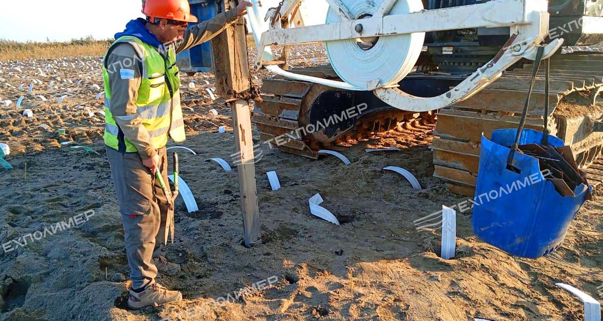 Специализированная техника погрузила геодрены на глубину до 28 метров в слабые водонасыщенные грунты. Для проекта использовалась дрена «ТехПолимер» с гибким полипропиленовым сердечником, окруженным износостойким геотекстильным фильтром. Конструкция ленточной дрены обеспечивает гарантированный водоотвод даже при высоком давлении грунта и позволяет проводить установку на глубинах более 45 метров. Принцип монтажа