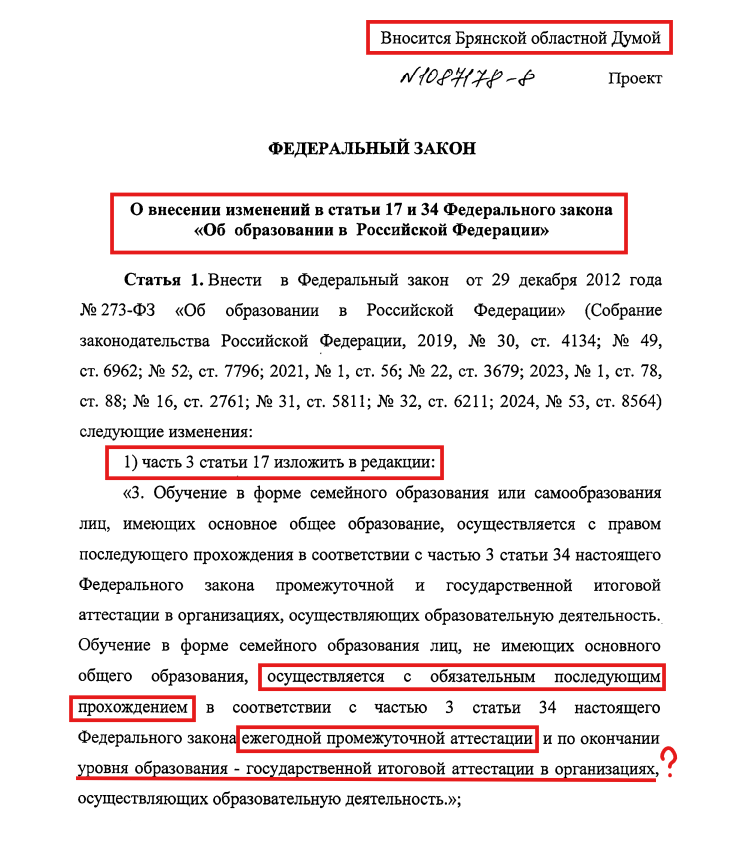 Брянская облДума в лице председателя Валентина Владимировича Суббот вышла с законодательной инициативой по внесению изменений в статьи 17 и 34 ФЗ "Об образовании в РФ", с целью установить обязательность прохождения ежегодной ПА для детей, находящихся на СО, не имеющих основного общего образования (с 1 по 9 классы). Законопроект на сайте СОЗД https://sozd.duma.gov.ru/bill/1087178-8. Изменения ч. 3 ст. 17 изложены так (скрин 1): Обучение в форме семейного образования лиц, не имеющих основного общего образования, осуществляется с обязательным последующим прохождением в соответствии с ч. 3 ст. 34 настоящего ФЗ ежегодной промежуточной аттестации и по окончании уровня образования - государственной итоговой аттестации в организациях, осуществляющих образовательную деятельность. Исходя из данного текста видно, что предлагается также обязать проходить по окончанию уровня ГИА. Видимо, инициаторы не знают о существовании ч. 3 ст. 59, где итоговая аттестация завершающая уровни основного и средне