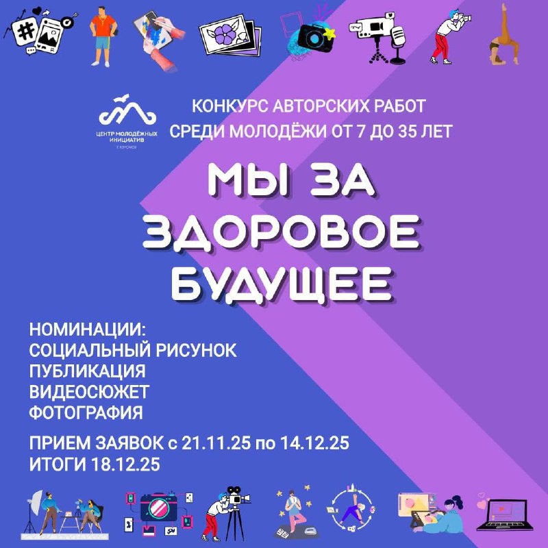 Корсаковцев приглашают принять участие в конкурсе «Мы за здоровое будущее!» 🎨Это ваш шанс выразить свою позицию, проявить таланты и внести вклад в важное дело — профилактику вредных привычек и пропаганду здорового образа жизни! 🚸Принять участие могут школьники, студенты и молодежь Корсаковского муниципального округа в возрасте от 7 до 35 лет. 🤩Номинации: «Социальный рисунок» (возрастные группы: 7-10, 11-14, 15-17, 18-35 лет) «Публикация» (очерк, статья, интервью; возрастные группы те же) «Видеосюжет» (для всех от 7 до 35 лет) «Фотография» (для всех от 7 до 35 лет) 🗓Работы принимаются с 21 ноября по 14 декабря 2025 года. 📝Для участия необходимо: Отправить заявку (положение и форма по ссылке ) и вашу работу в форматах PDF и WORD на электронную почту: maucmi@sakhalin.gov.ru. В теме письма обязательно указать: Фамилию автора, «Конкурс авторских работ «Мы за здоровое будущее!». 🏅Авторы лучших работ в каждой номинации и возрастной группе будут награждены грамотами, а все участни