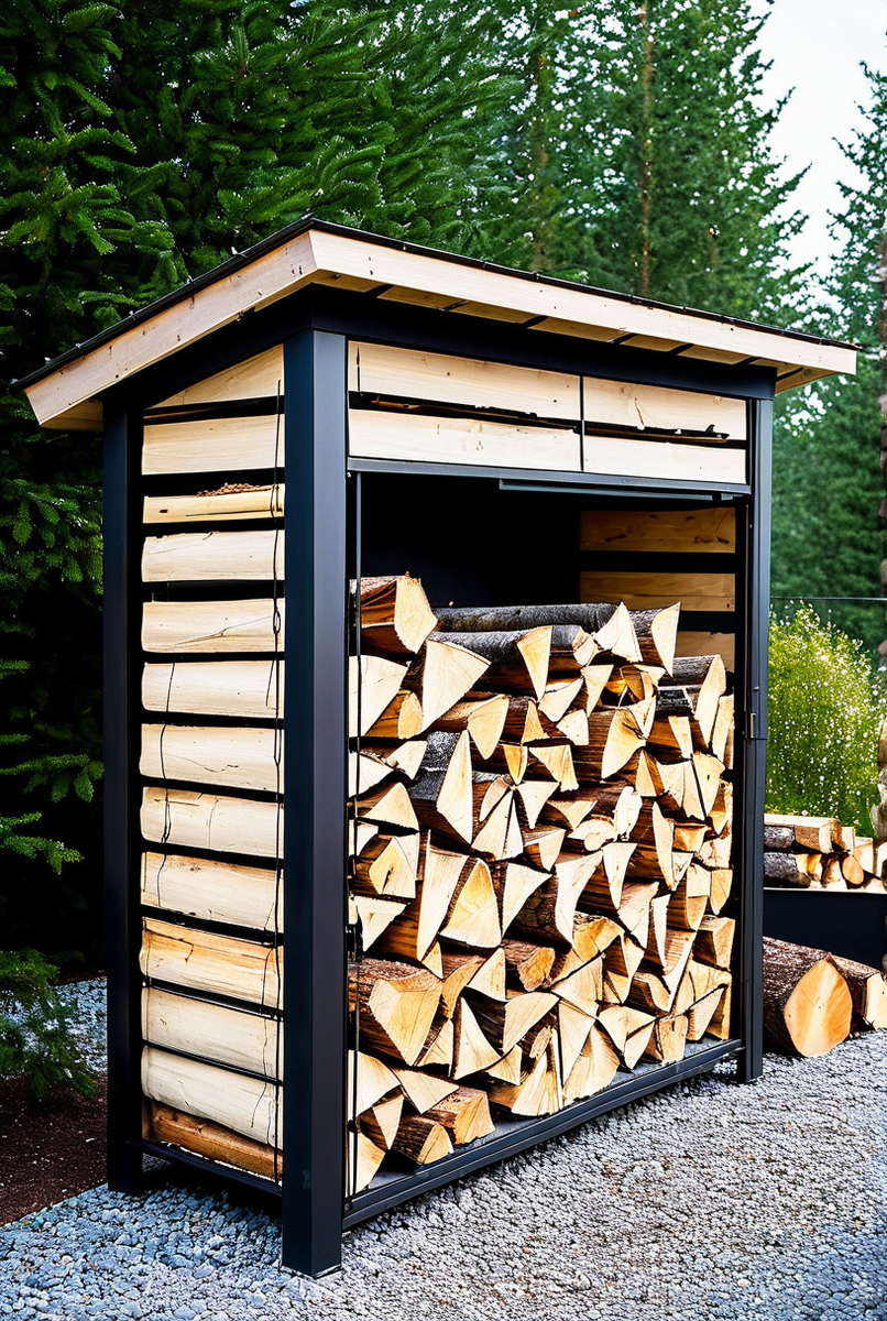 Выбор и установка: размер, вместимость, сушка поленьев (вентиляция, защита от осадков с крышей/навесом) и размещение на участке