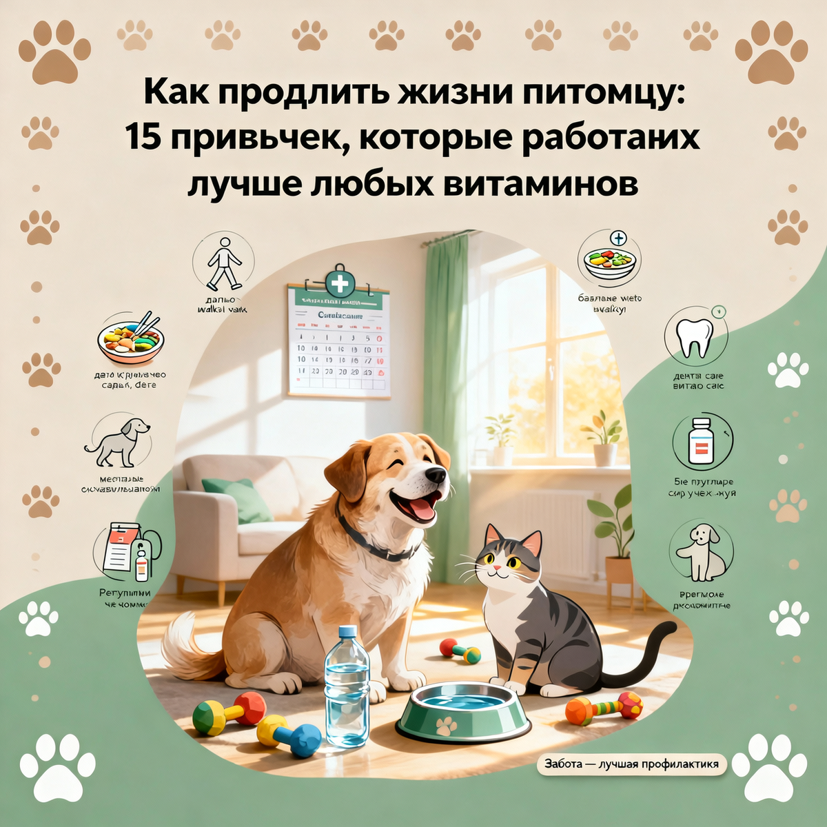 Каждый хозяин мечтает, чтобы любимец жил как можно дольше. И хороший уход продлевает жизнь больше, чем гены. 1. Правильное питание Корм — это 70% здоровья. Экономия на нём выходит дороже. 2. Контроль веса Каждый лишний килограмм — удар по сердцу и суставам. 3. Чистая вода 24/7 Обезвоживание — тихий враг. 4. Ежедневная активность Даже 10–15 минут игр для кота — уже вклад в здоровье. 5. Регулярные анализы Раз в год — минимум. 6. Профессиональная чистка зубов Зубной камень сокращает жизнь на годы. 7. Качественный сон Животному нужен уголок, где его никто не тревожит. 8. Ментальная нагрузка Игрушки, тренировки, новые маршруты. 9. Любовь и внимание Животные болеют от одиночества. 10. Чистота дома Пыль и химия влияют на питомцев сильнее, чем на людей. 11. Правильная температура Жара — сильнейший стресс для собак и котов. 12. Плавный груминг Частая линька — нормальна. Колтуны — нет. 13. Профилактика паразитов Клещи → пироплазмоз → летальный исход. 14. Безопасная среда Уберите провода, химию,