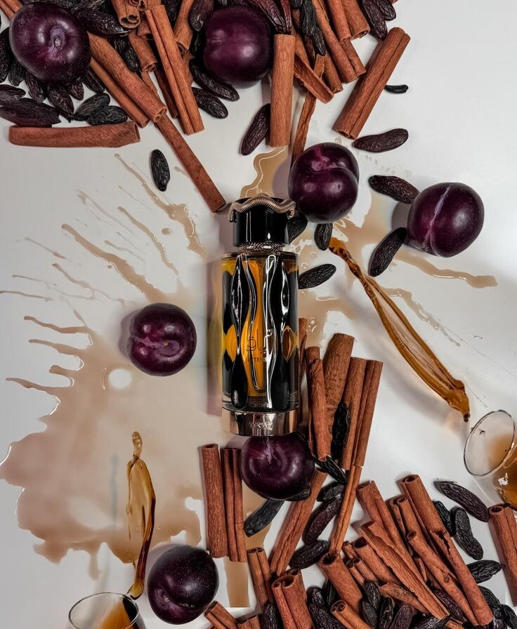 Но на холодной коже это аромат средней плотности по меркам Биша. Ganymede будет в разы плотнее и тяжелее. Стойкость отличная, на весь день. Шлейф явный, но, опять же , по меркам Биша , средний. А если абстрагироваться от Квентина, то шлейф хороший. Собран TI (Teriaq Intense) чисто и звучит дороже своих денег. Вступает ярко и чуть алкогольно сливовым ликером с корицей, что так согревает, уютненько и вообще в тему осени, но все действо сглажено лактонным оттенком бобов тонка и амбры, кои дают чуть молочного тумана. Считай у вас десерт с начинкой из сливового джема с корицей, который полили ромом, устроили легкое фламбе, а сверху украсили шапочкой из растительных сливок. Они тут воздушные, легкие и без жирного эффекта. Конечно, если греть нос, вы будете ловить легкие вишневые оттенки от бобов тонка, но вишня тут на задворках «истории». А аромат все же про сливовый оттенок. Но интересно тем, что я ощущаю, еще легкий сухой вайб табака, хоть по пирамиде и нет ничего такого. И вот за счет этого "табака" , едой и не звучит.