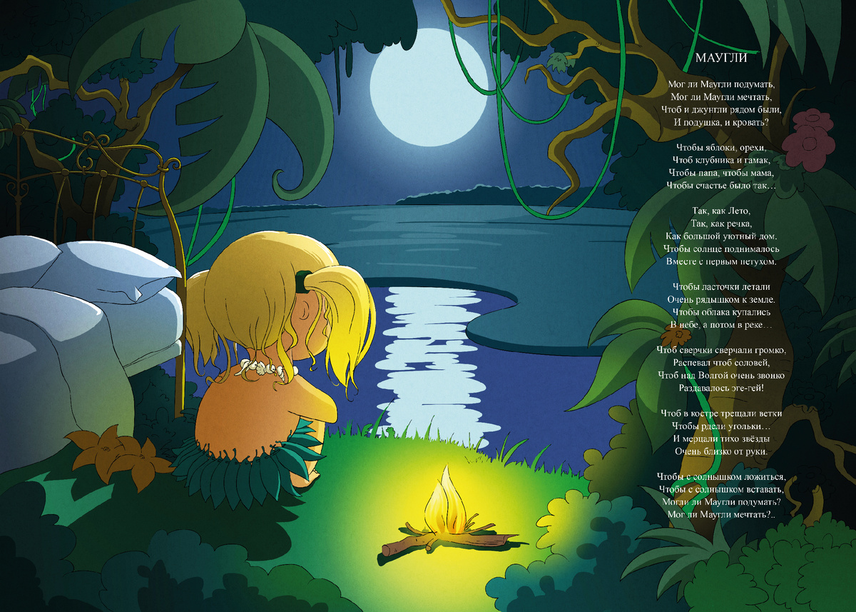 Мог ли Маугли подумать, Мог ли Маугли мечтать, Чтоб и джунгли рядом были, И подушка, и кровать? Чтобы яблоки, орехи, Чтоб клубника и гамак, Чтобы папа, чтобы мама, Чтобы счастье было так… Так, как Лето, Так, как речка, Как большой уютный дом. Чтобы солнце поднималось Вместе с первым петухом. Чтобы ласточки летали Очень рядышком к земле. Чтобы облака купались В небе, а потом в реке… Чтоб сверчки сверчали громко, Распевал чтоб соловей, Чтоб над Волгой очень звонко Раздавалось эге-гей! Чтоб в костре трещали ветки Чтобы рдели угольки… И мерцали тихо звёзды Очень близко от руки. Чтобы с солнышком ложиться, Чтобы с солнышком вставать, Могли ли Маугли подумать? Мог ли Маугли мечтать?..