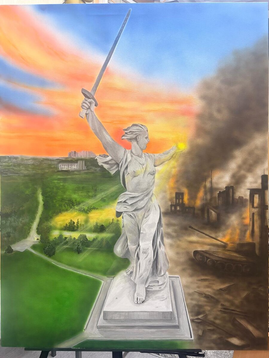 Я с радостью расскажу про эту картину — она родилась как заказ, который тронул меня до глубины души. Я и сама живу в Волгограде, где возвышается эта великая статуя "Родина Мать", поэтому для меня этот заказ был особенно значимым. Композиция и идея: