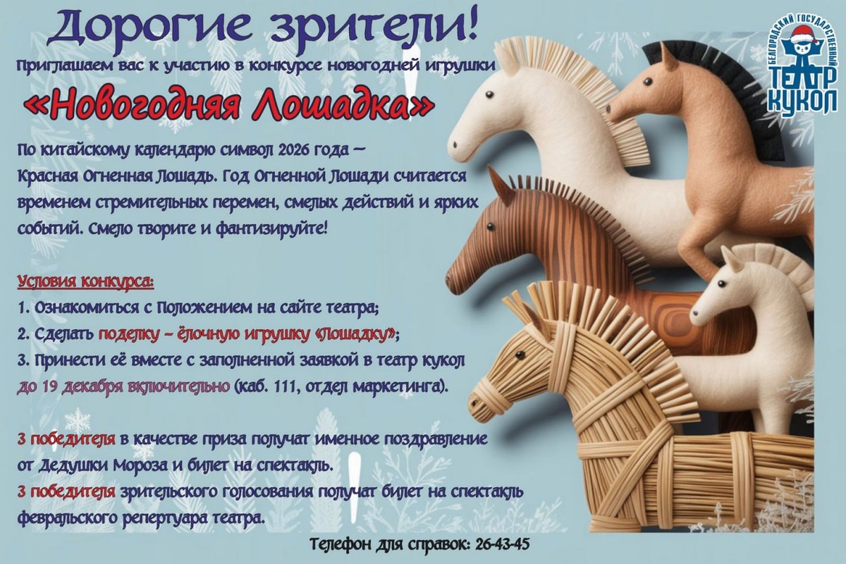 В Белгородском театре кукол стартует конкурс ёлочных игрушек «Новогодняя лошадка» 🎭🎄🎅🐴 Приближается время новогодних чудес.. А мы объявляем о начале творческого конкурса, в котором наши зрители могут принять участие уже сейчас. ❗️Друзья! Внимательно ознакомьтесь с правилами в Положении на сайте театра в разделе «Конкурсы» 👉https://bgtk.org/contests/#content и приступайте к созданию эксклюзивных новогодних талисманов!