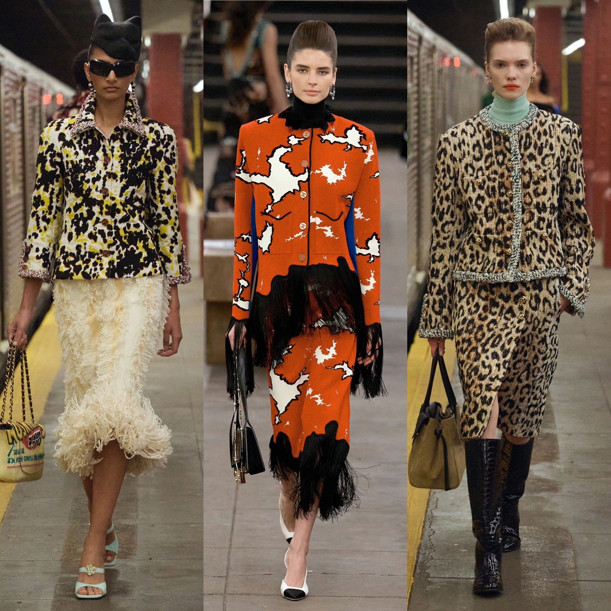 Коллекция Métiers d’art New York 2025/26 Есть показы, которые невозможно не пересматривать тысячу раз. Именно таким для меня стало шоу Chanel в метро. Под сводами закрытой станции Бовэр в Нью-Йорке дом показал свою уникальную коллекцию Métiers d’art, где ремесло работает на пределе мастерства, а кутюр тонко смешивается с уличной модой. И это первый выход в Нью-Йорке нового креативного директора дома, Матье Блази. Его взгляд на Шанель оказался свежим, точным и, признаюсь честно, привёл меня в восторг. Фактуры Твид здесь не просто наследие, а живая среда. Он выглядит как потертый деним, как городская рабочая ткань, как фактура для вечера. Букле держит форму, словно архитектура тоннелей. Бархат появляется как глубокая тень, а вышивка превращается в объем, который хочется рассматривать . Это настроение Chanel, которое ощущаешь кожей. Принты Отдельный восторг вызвала работа с принтами. Леопард, зебра, графические полосы, всё это смешано дерзко и при этом очень интеллигентно.