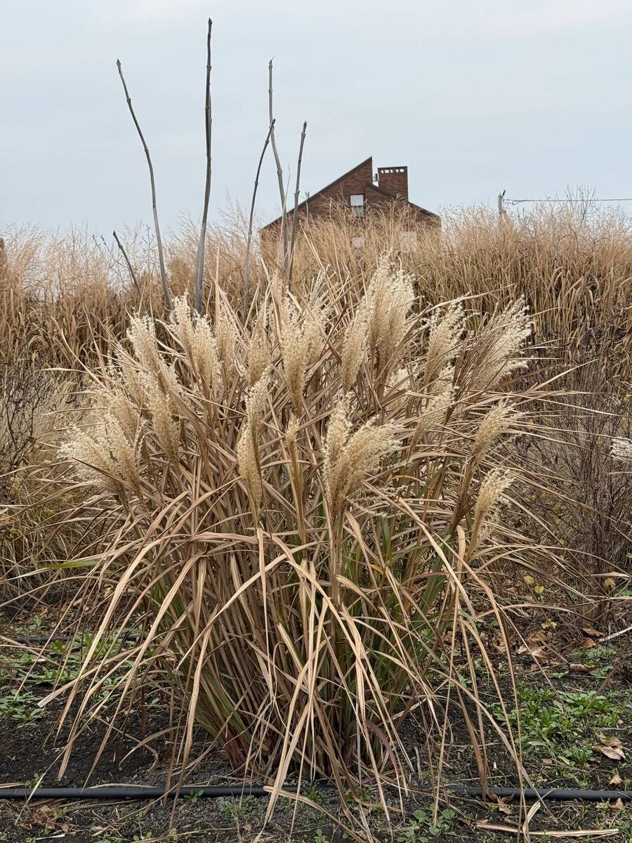 Мискантус китайский ‘Кореа’ Miscanthus sinensis ‘Korea’ Редкий и по-настоящему выразительный сорт с аккуратной сферической формой. Широкие дуговидные листья формируют плотный зеленый шар, а в конце лета появляются светлые, слегка желтоватые метелки, украшая сад до зимы. В этом году при слабом поливе высота растений не превысила 80 см, что еще раз подтверждает: сорт реагирует на влажность, но при этом сохраняет аккуратный внешний вид. ‘Кореа’ предпочитает солнечные участки и плодородные, хорошо дренированные почвы. Любит умеренный полив, переносит кратковременную засуху и отличается зимостойкостью зоны 5 (до –28°С). Идеален для малых садов, рокариев, контейнерных посадок и прибрежных композиций — всегда держит форму без подвязки.