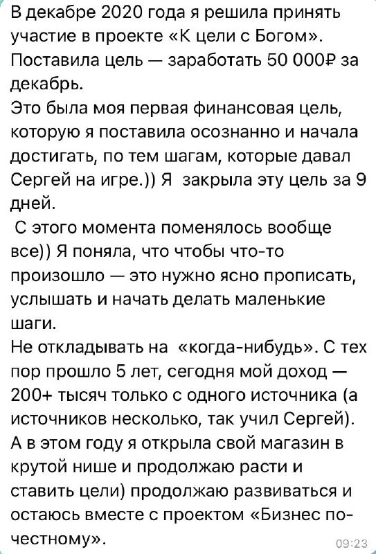 «Прошло 5 лет, сегодня мой доход 200 000+ с одного источника» ⠀ Этот отзыв — пример того, что происходит, когда цель перестаёт быть мечтой. ⠀ В 2020 году она впервые пришла в проект «К цели с Богом». Поставила свою первую финансовую цель — заработать 50 000₽ за декабрь. ⠀ Начала идти по шагам, которые я даю в игре. Через 9 дней цель была закрыта 🔥 ⠀ Но самый важный момент не в сумме. «Чтобы что-то произошло — это нужно прописать, услышать и начать делать маленькие шаги. Не откладывать на “когда-нибудь”. С этого момента поменялось вообще всё». ⠀ Прошло 5 лет. Сегодня доход 200 000+ с одного источника (хотя источников несколько — так я учу). ⠀ ⚡️Сегодня мы стартуем. Ты успеваешь залететь к нам в поток. ⠀ Если хочешь, чтобы следующий год не «случился», а сложился — присоединяйся. ⠀ С Богом — к цели.