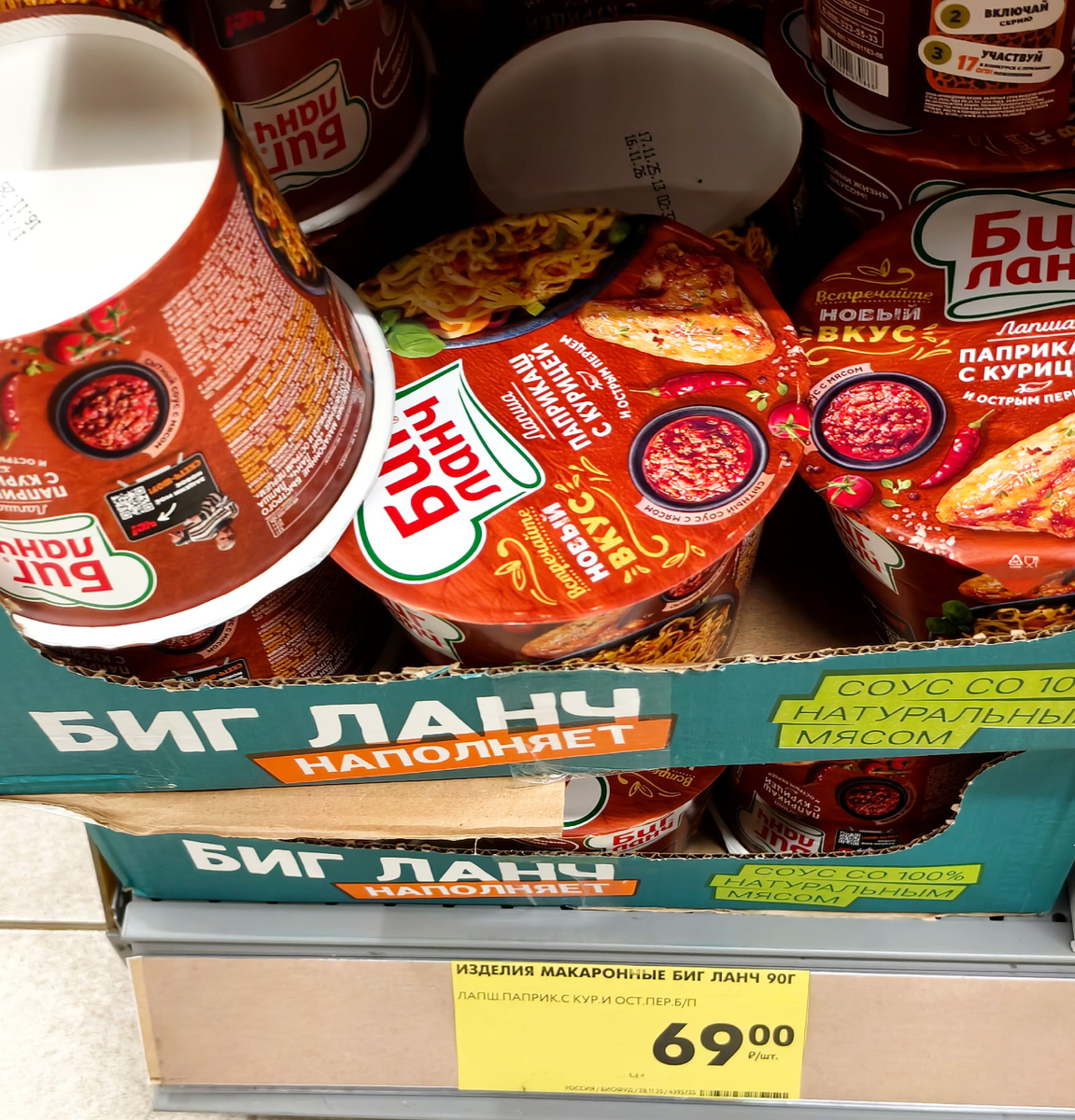 Завезли в Чижик такую лапшичку новую от Биг Ланча. Цена 69 рублей. Новая линейка вкусов у них прикольная. Два вида я уже пробовал, такой ещё нет.