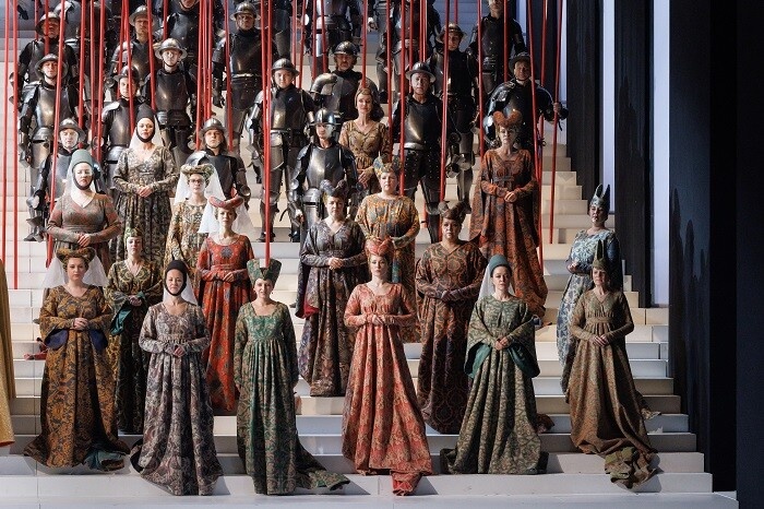 Обе интерпретации – авторские, постмодернистские, с недоверием берущиеся за материал, не верящие в его искренность, иронично насмехающиеся над ним. Да и вообще, многие режиссеры старались и стараются преодолеть ораториальную сущность этой оперы, сделать ее как бы более живой, сценичной, драматургически размятой и логичной: если в советское время ей усиленно добавляли исторического реализма, то в постсоветское – постмодернистского стеба. И, как правило, проигрывали тогда и проигрывают сегодня и те, и те – музыкальная суть этого сочинения очень сопротивляется любому такому нарочитому «оживляжу». Александр Титель почти не делает этой ошибки, как раз подчеркивая статуарность и условность этой оперы, – поэтому на сцене художник Владимир Арефьев размещает гигантский ступенчатый подиум, белоснежную бесконечную лестницу, устремленную в те самые надзвездные миры, откуда слышит божественные голоса ангелов нездешняя «инопланетянка» Иоанна. Все действие разворачивается на ней, и оно не суетно, во многом ораториально-концертно, но обличено в приличествующие позднему Средневековью картины Столетней войны, за которые отвечают костюмы героев – рыцарские латы, куртуазные проторенессансные головные уборы и обилие богатых тканей, в которые закутаны статусные герои этой истории, вроде короля Карла, его фаворитки Агнесы Сорель или Архиепископа. Минимализм сценографии (помимо лестницы – черные ширмы-панели, свисающие с колосников, двигающиеся параллельно зеркалу сцены, и каждый раз по-новому формирующие мизансценическое пространство, да редкий реквизит – благодаря этой редкости он всегда приковывает внимание и выглядит выпукло) ярко контрастирует с богатством одежд, создавая и визуальное напряжение, и одновременно оставляя спектакль сразу в двух пространствах – костюмно-исторического действа и современной эстетики. Вроде бы ход не новый, но работающий безотказно – картинка получается и эстетская, и разумная.